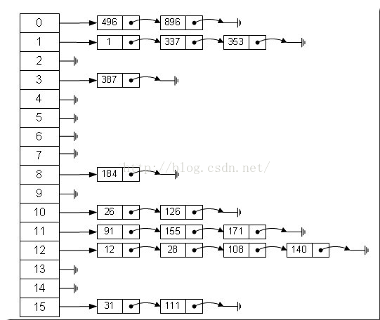 左边为一个数组,数组的每个成员包括一个指针,指向一个链表的头,我们根据元素的一些特性把元素分配到不同的链表中去,也是根据这些特性找到正确的链表,再从链表中找出这个元素。